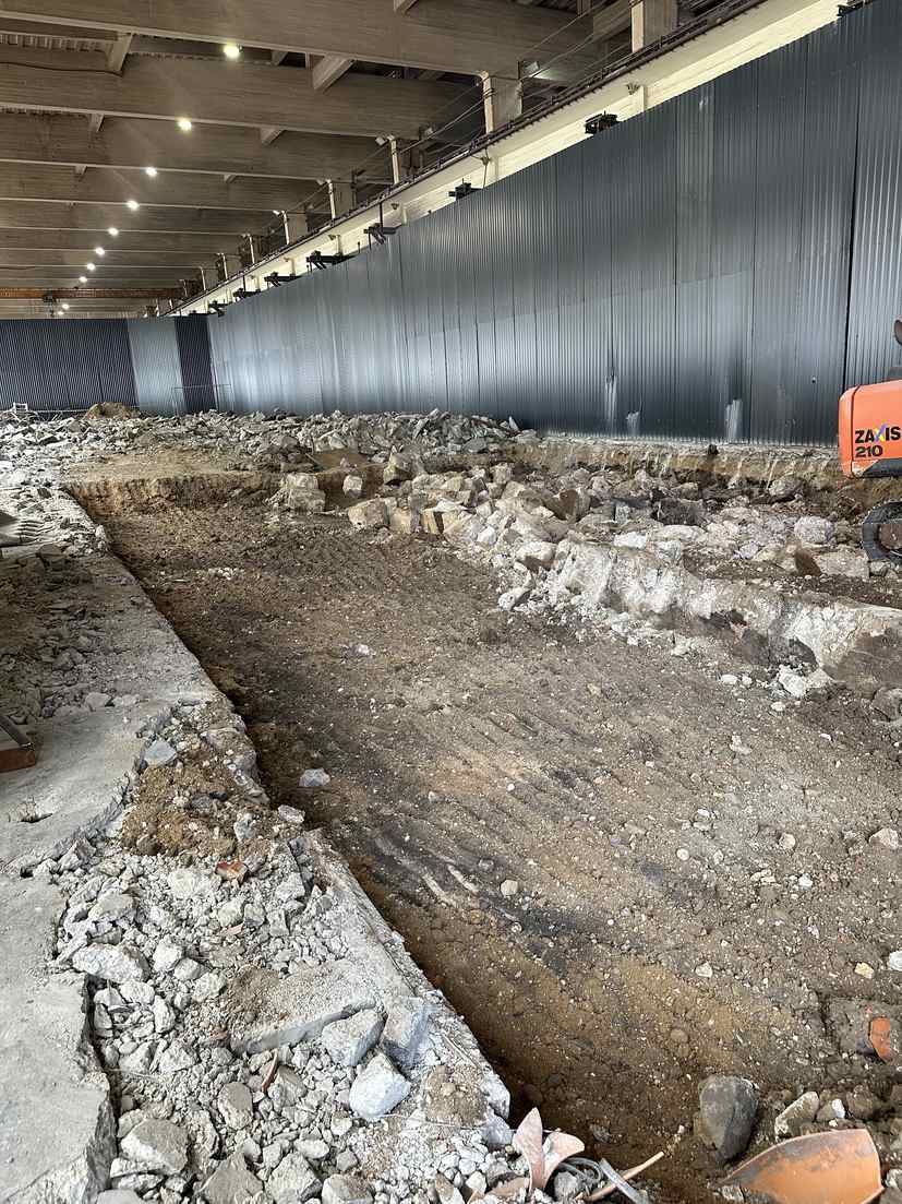 Bontás és kitermelés: A projekt első fázisában a meglévő, elöregedett betonfelület feltörését végeztük el. A hatékony földmunka részeként a beton alatt található régi talajréteget a szükséges mélységig kiszedtük, helyet biztosítva az új, teherbíró rétegrendnek.
